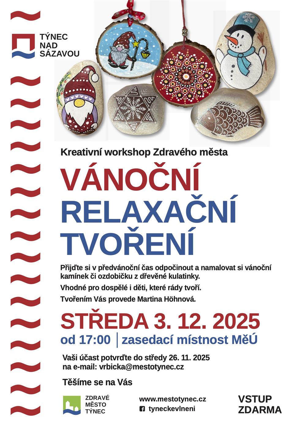 Tvořit budeme dřevěné ozdobičky (kolečka) technikou malování nebo tečkování a malovat kamínky s vánoční tématikou.Workshop je vhodný pro dospělé i děti, které rády tvoří.Tvořením nás provede Martina Höhnová.Zájemce prosíme, aby svou účast potvrdili na e-mail: vrbicka@mestotynec.cz do středy 26.11.2025, abychom mohli zajistit dostatek materiálu.Těšíme se na Vás.