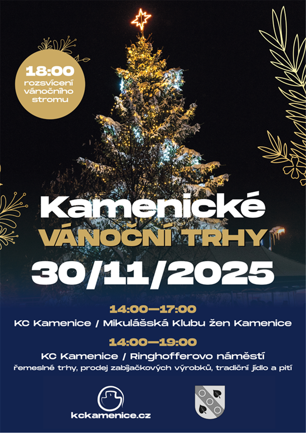 program:14:00–17:00Kulturní centrum KameniceMikulášská nadílka Klubu žen Kamenice……………………………………………………………14:00–19:00Kulturní centrum Kamenice / Ringhofferovo náměstířemeslné trhy, obecní zabijačka, zpívání koled s Kamenickým pěveckým sborem, slavnostní rozsvícení vánočního stromu v 18:00 hodin