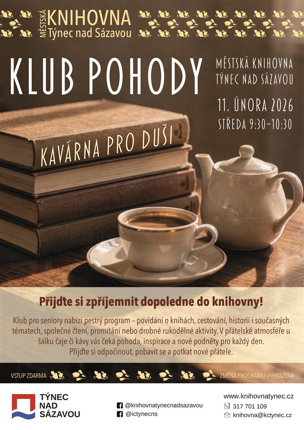 Přijďte si zpříjemnit dopoledne do knihovny!Klub pro seniory nabízí pestrý program – povídání o knihách, cestování, historii i současných tématech, společné čtení, promítání nebo drobné rukodělné aktivity. V přátelské atmosféře u šálku čaje či kávy vás čeká pohoda, inspirace a nové podněty pro každý den. Přijďte si odpočinout, pobavit se a potkat nové přátele.