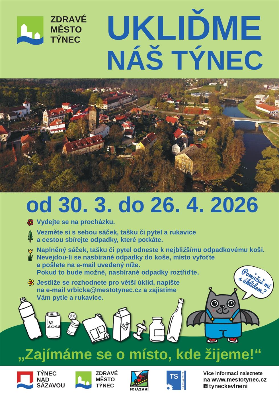 Pojďme společně udělat naše město čistší. Vydejte se na procházku. Vezměte si s sebou sáček, tašku či pytel a rukavice a cestou sbírejte odpadky, které potkáte. Naplněný sáček, tašku či pytel odneste k nejbližšímu odpadkovému koši. Pokud to bude možné, nasbírané odpadky roztřiďte. Nevejdou-li se nasbírané odpadky do koše, místo vyfoťte a pošlete na e-mail uvedený níže. Jestli se rozhodnete pro větší úklid, napište na e-mail vrbicka@mestotynec.cz a zajistíme Vám pytle a rukavice. Děkujeme, že se zajímáte o místo, kde žijeme a děláte naše město hezčí.