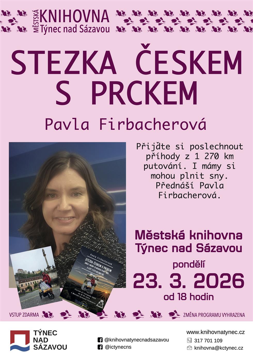 Přijďte si poslechnout příhody z 1270 km putování. I mámy si mohou plnit sny. Přednáší Pavla Firbacherová.Vstup zdarma.Změna programu vyhrazena.