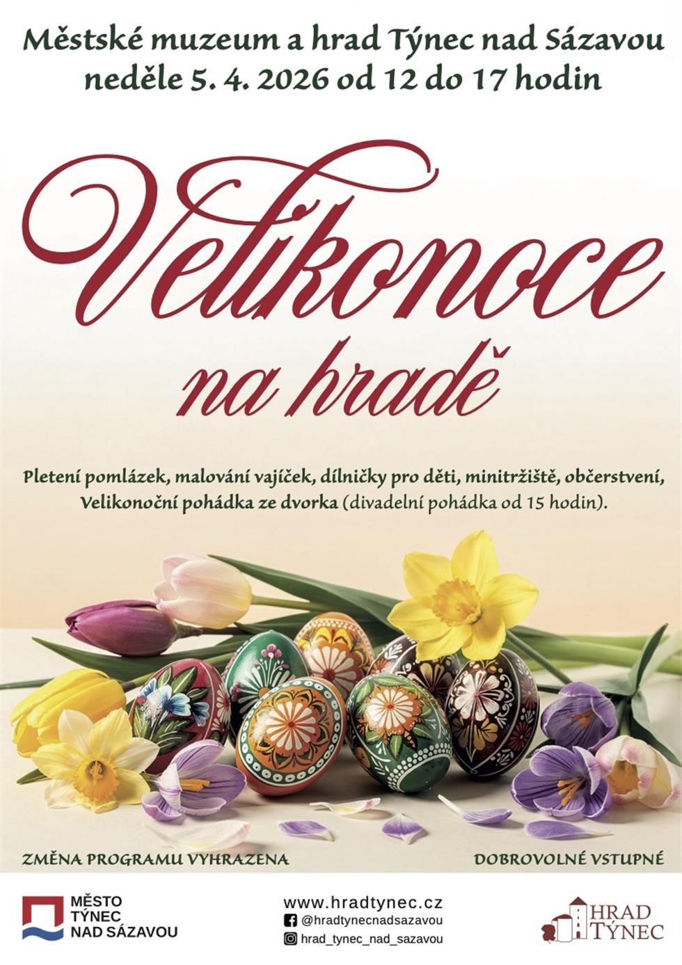 Zavítejte o velikonoční neděli do areálu Týneckého hradu. Od 12 do 17 hodin bude připraveno pletení pomlázek, malování vajíček, dílničky pro děti, minitržiště a občerstvení.