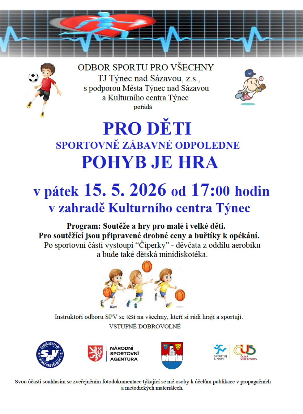 TJ Týnec nad Sázavou Vás zve sportovně zábavné odpoledne do zahrady Kulturního centra Týnec. Sportovní i dovednostní soutěže a hry pro malé i velké děti, pro soutěžící jsou připravené drobné odměny formou tomboly a buřtíky k opékání.
