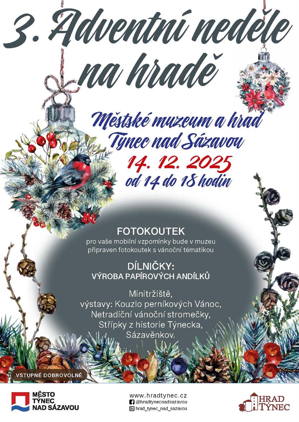 Navštivte Městské muzeum a hrad v době 3. Adventní neděle od 14 do 18 hodin. Těšit se můžete na připravený vánoční fotokoutek pro vaše mobilní vzpomínky. Dále budou připraveny dílničky a minitržiště. Můžete také navštívit výstavy Kouzlo perníkových Vánoc, Netradiční vánoční stromečky, Sázavěnkov a Střípky z historie Týnecka.