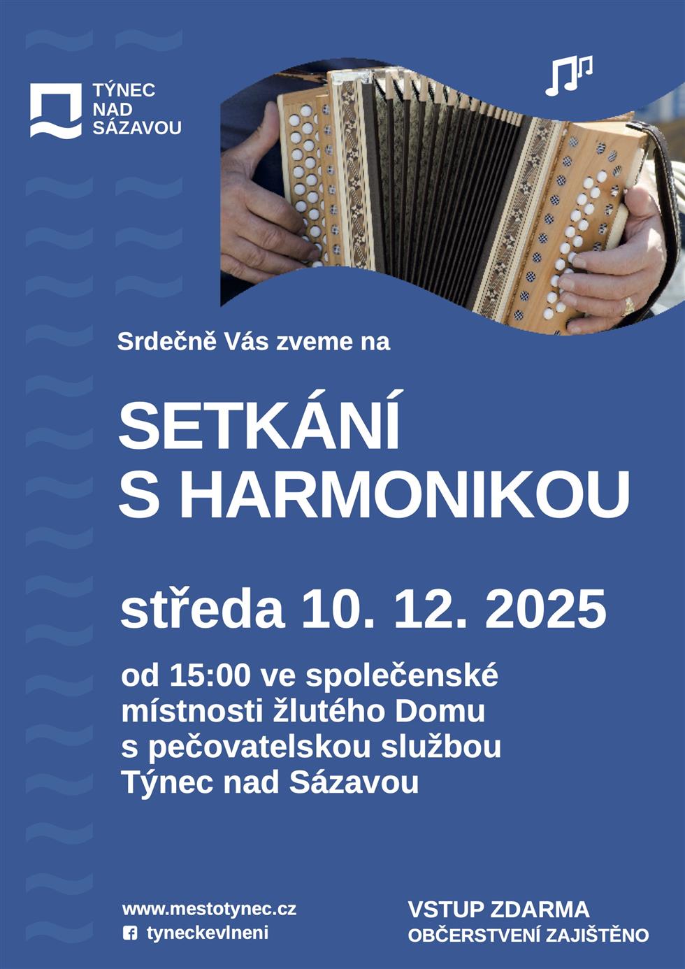 Město Týnec nad Sázavou Vás srdečně zve na Setkání s harmonikou. Přijďte si poslechnout hraní na harmoniku. Představí se pan Bumbálek a spol.. Občerstvení v podobě chlebíčků a zákusků zajištěno.