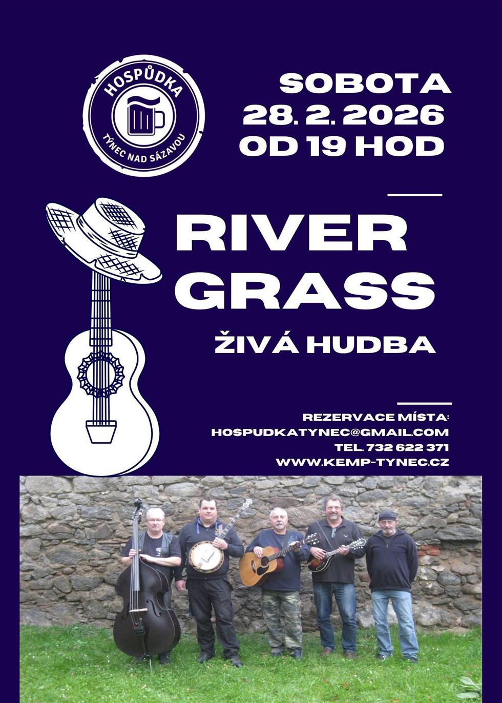 Zveme vás na večer s živou hudbou v podání kapely River Grass. Těšit se můžete na příjemnou atmosféru, kvalitní muziku a posezení s přáteli v prostředí hospůdky v Náklí. Doporučujeme rezervaci míst předem.www.kemp-tynec.cz