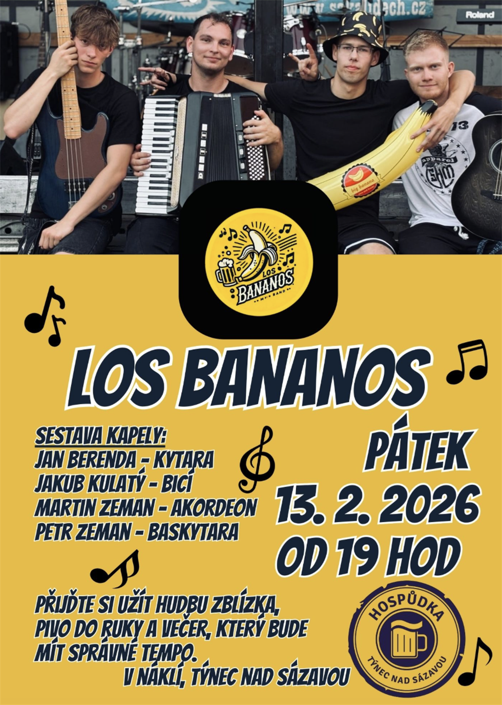 Los Bananos – čtyřčlenná kapela z Bystřice a okolí Benešova, která vznikla v roce 2024. Hrají alternativní rock a výhradně vlastní písně, ale rozhodně se nebojí experimentů, zvlášť, když to rozhejbe publikum. Naše hudba je směs energie, nadsázky a hlavně poctivé muziky.