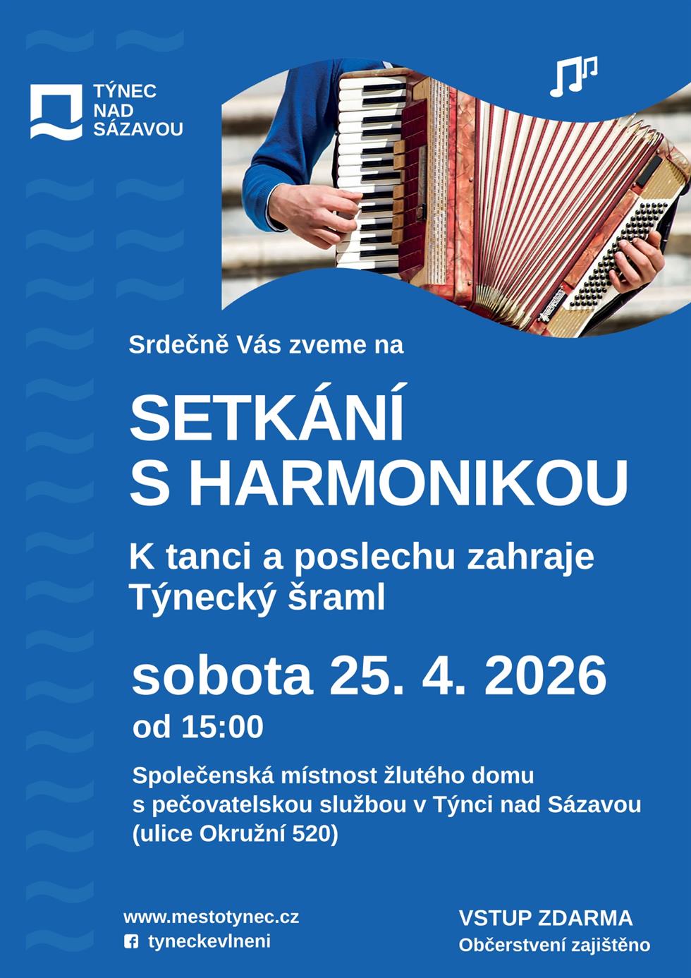 Město Týnec nad Sázavou Vás srdečně zve na Setkání s harmonikou. Přijďte si poslechnout místní hudební skupinu Týnecký šraml. Využijte příležitost zatančit si a zazpívat. Čeká Vás i občerstvení. Těšíme se na Vás.